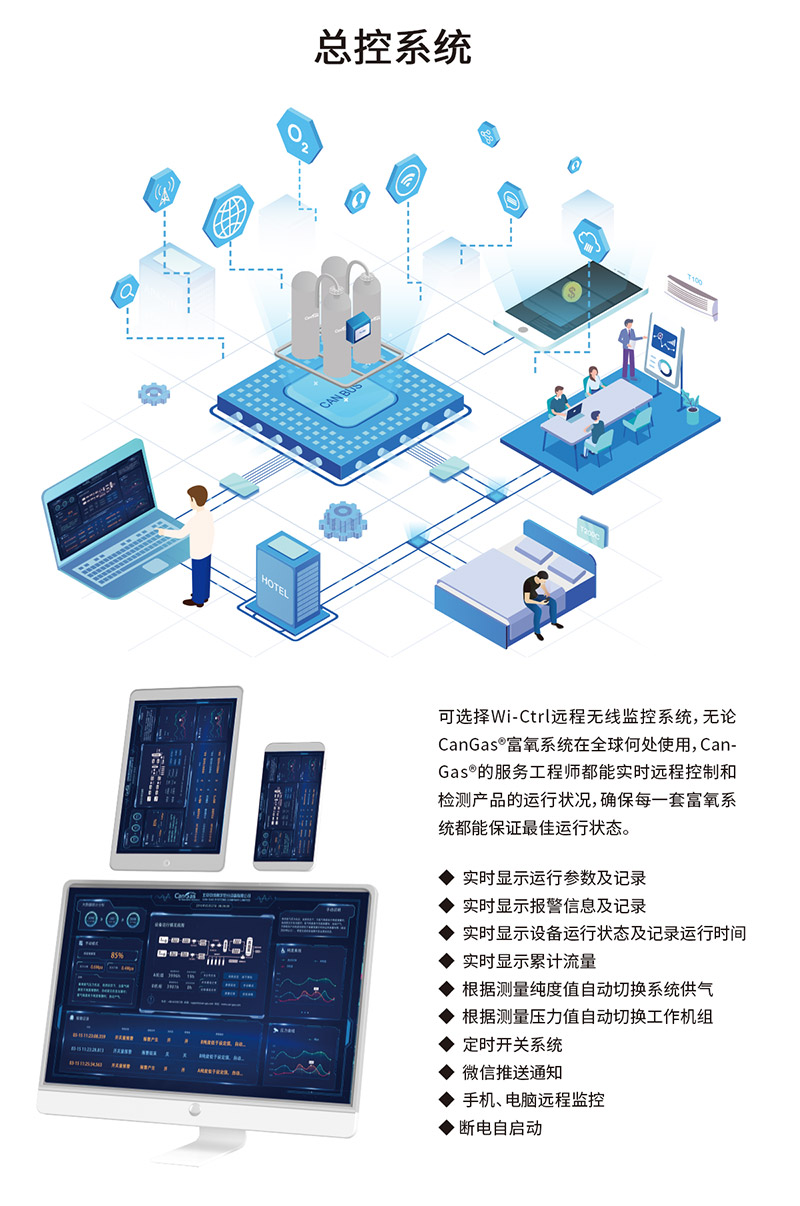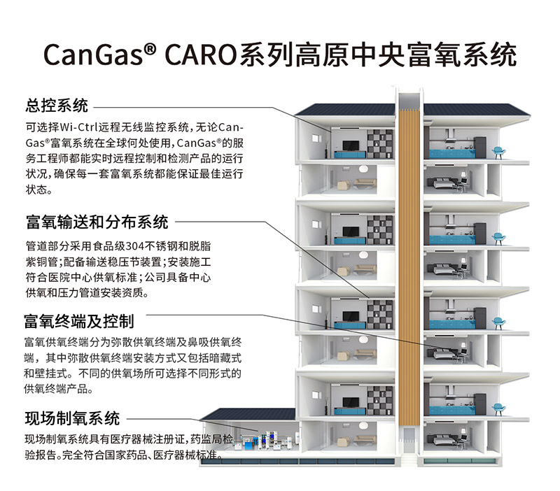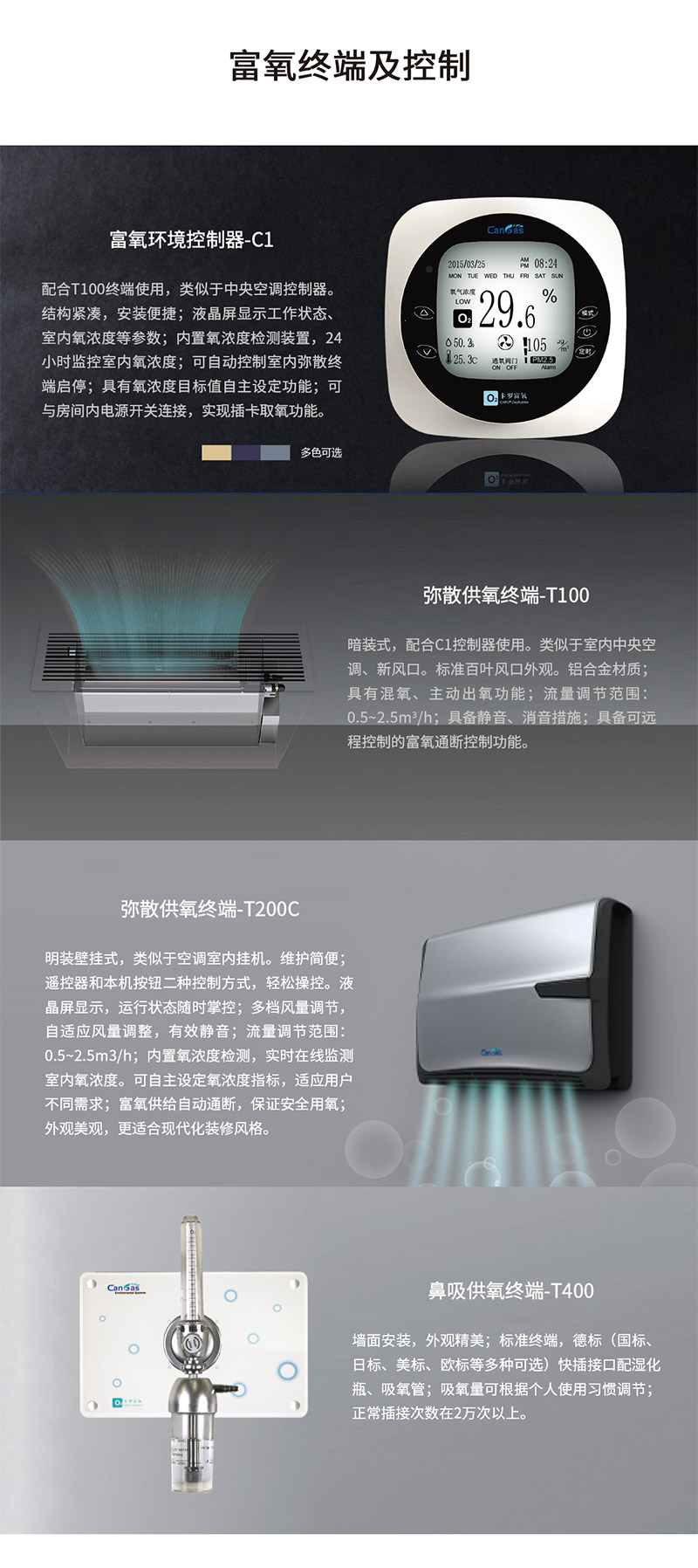 可實現(xiàn)多個房間、多種功能空間、多種環(huán)境的富氧環(huán)境建立和調(diào)節(jié)。是由現(xiàn)場制氧系統(tǒng)、新風及富氧調(diào)節(jié)系統(tǒng)、富氧輸送及分布系統(tǒng)、富氧終端及控制構(gòu)成。